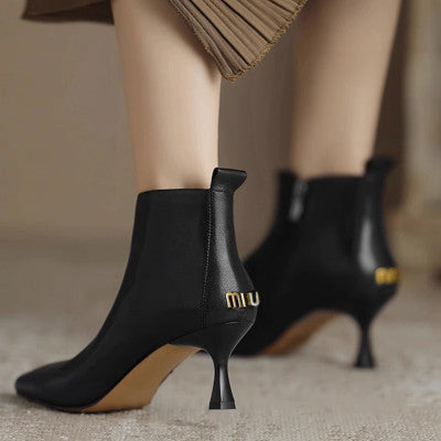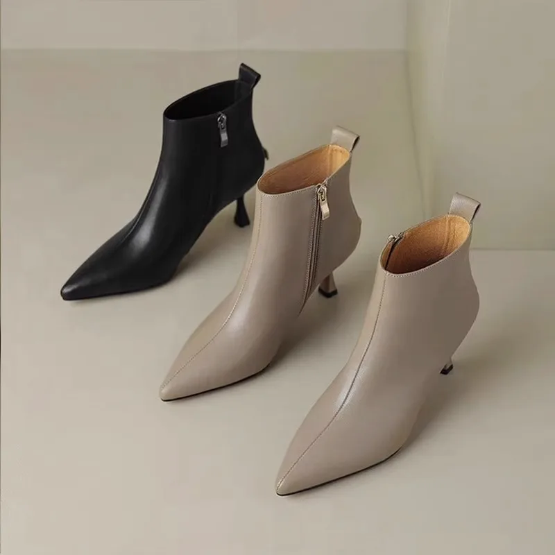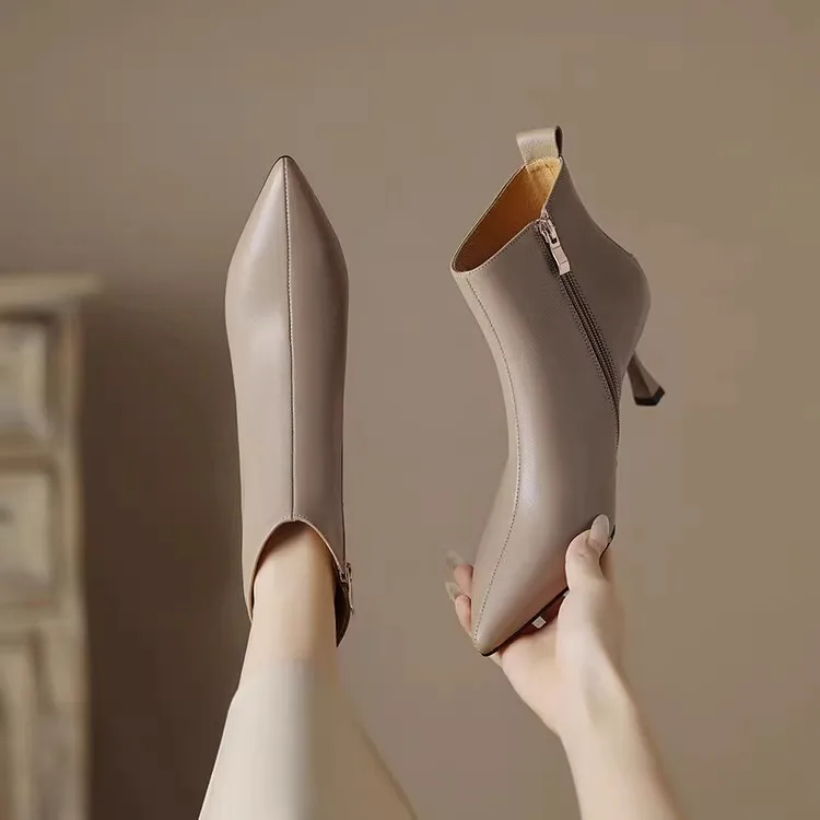 حذاء نسائي شتوي جديد على الموضة بكعب عالٍ للمكتب اليومي 2024 بسيط بلون سادة حذاء نسائي قصير غير رسمي للخروج