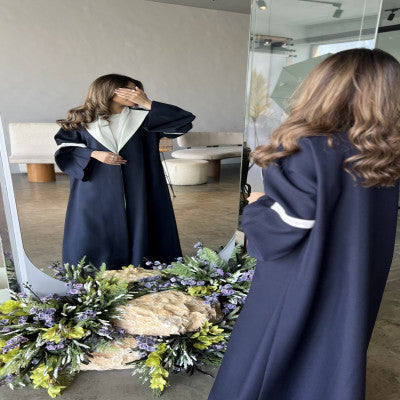 عبايه كحلي وابيض من أجود أنواع القماش بقصة بليزر وبلون كحلي رائع مدمج مع اللون الابيض على الياقه واطراف الاكمام.