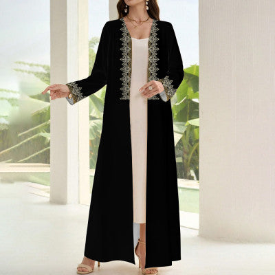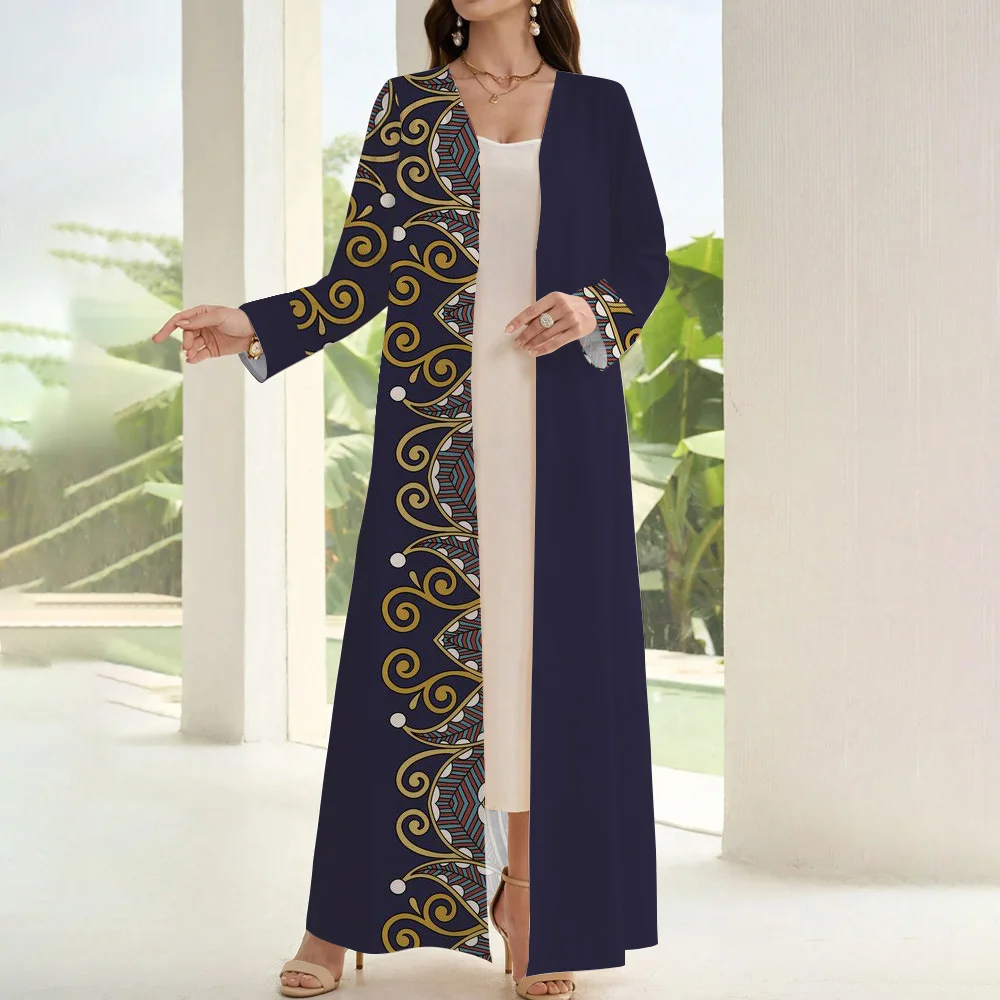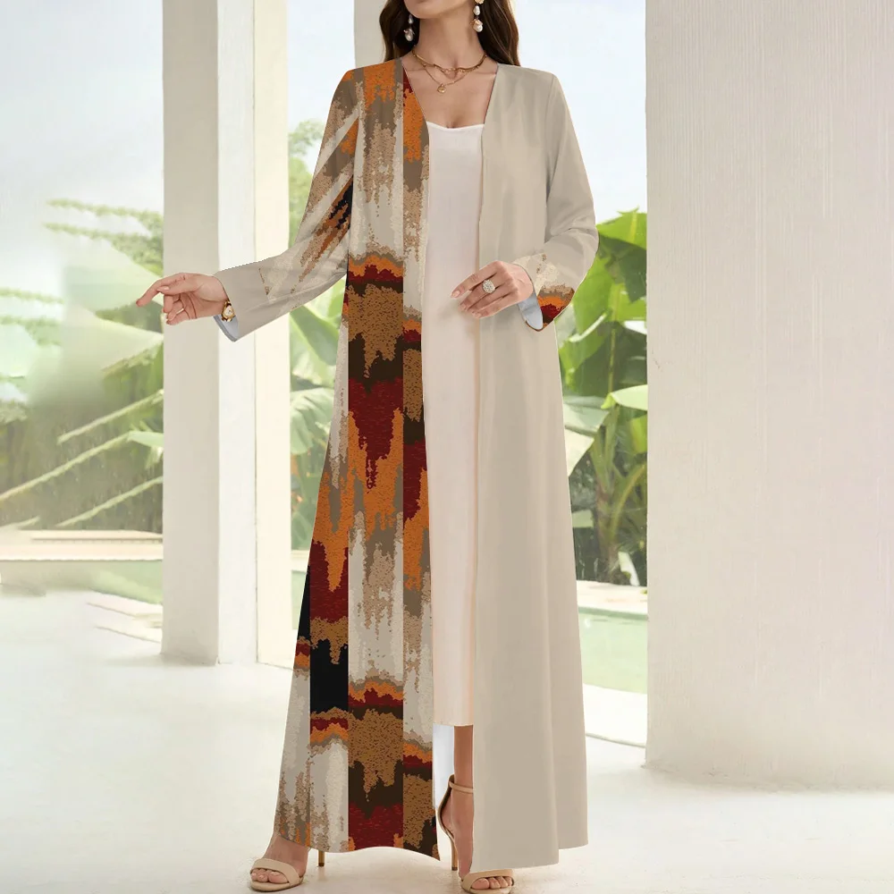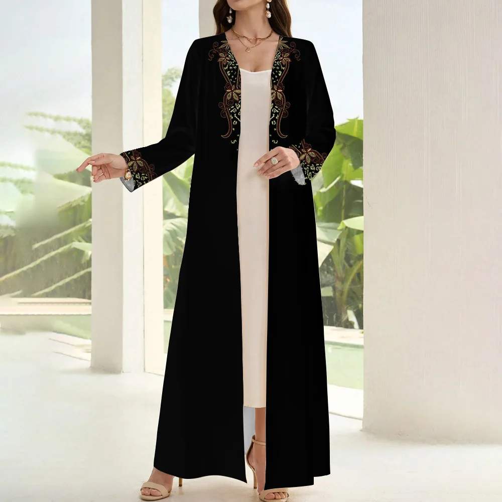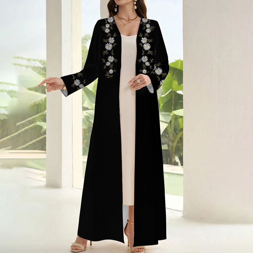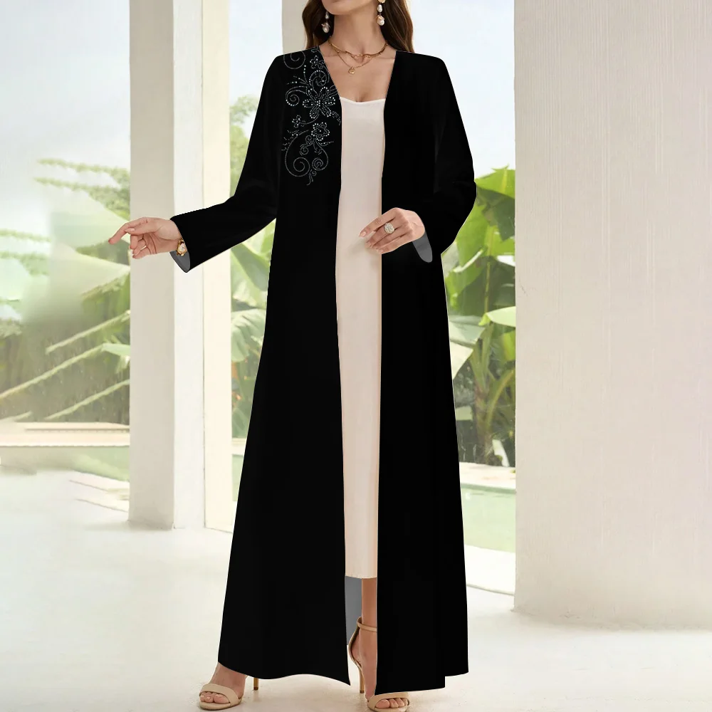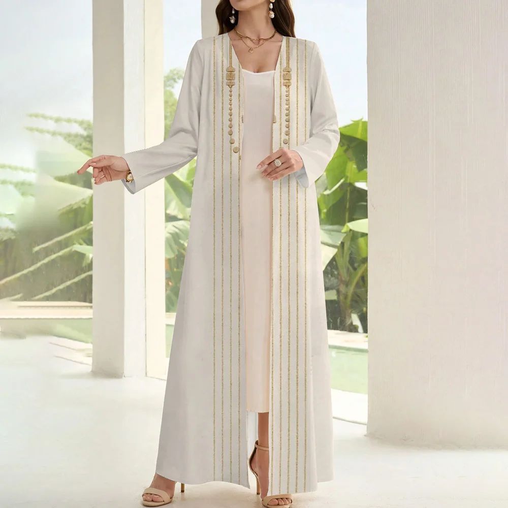 تصميم من قطعتين: عباية كيمونو مفتوحة + فستان بحمالة رقبة بيضاء